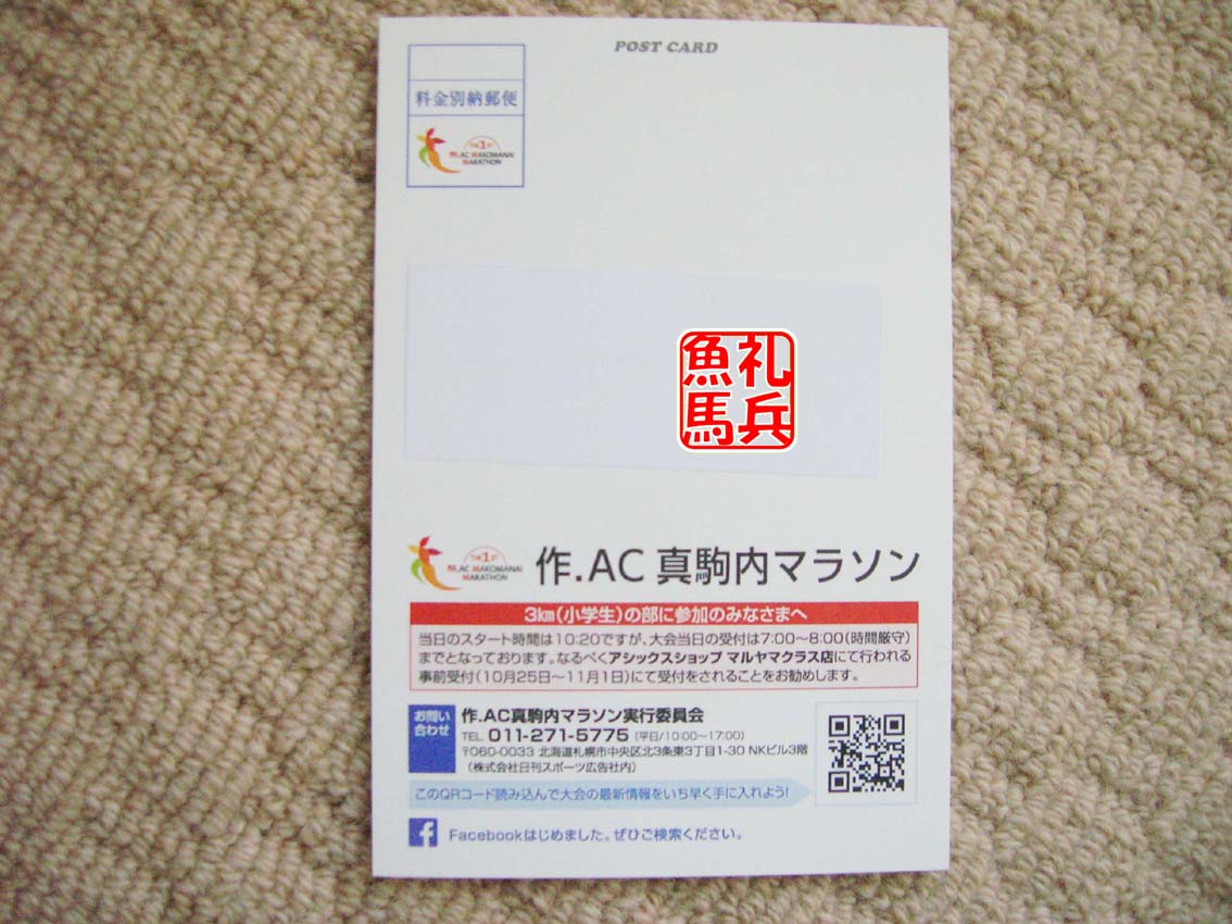 10月17日(金)に作.AC真駒内マラソンからハガキが届きました。 きっと、ゼッケン引換券だと思うのですが、どこにも記載されていないし、ゼッケン交付時に持ってくるようにも書かれていません。