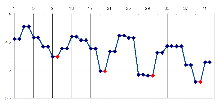 上のグラフはスタートから、ゴールまでのラップタイムです。
