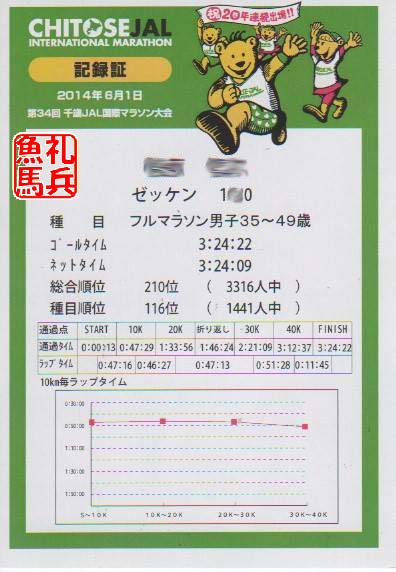 初マラソンの千歳JAL国際マラソンでは、ネットタイム3時間24分9秒で完走した。
